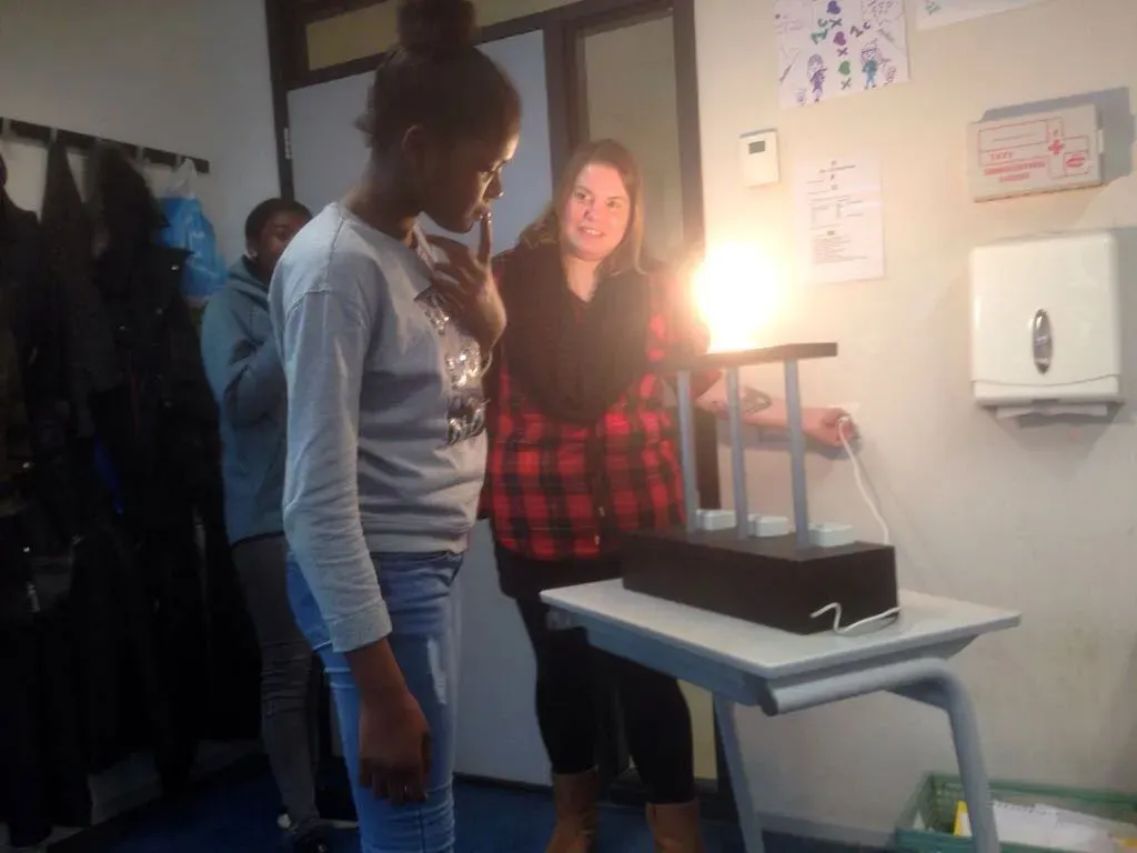Hierboven Aniky in actie. Laat ze zich overhalen door de groep om de stangen beet te pakken waar 220 volt op staat? (Uiteindelijk deed ze het en kwam erachter dat er geen stroom op stond.)