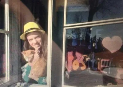 We zitten dagen binnen en dan zijn ramen ons enige venster naar de buitenwereld. Hoe kunnen we dat uitzicht een beetje opvrolijken? (Foto 3 – Raamkunst van Zoe)